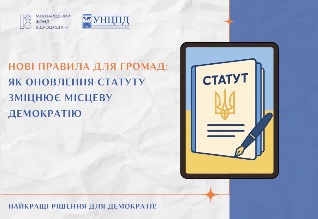 Експерти УНЦПД підготували проєкт модельного статуту територіальної громади та 4 обов’язкові додатки до нього: про громадські слухання, загальні збори жителів, місцеві ініціативи і громадське оцінювання роботи органів місцевого самоврядування. До кожного додали шаблони документів, щоб громадам не доводилося щоразу «вигадувати велосипед».