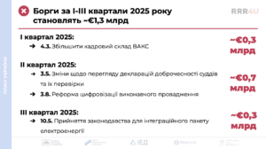 - Невиконані 11 індикаторів за IV квартал 2025 року на понад €2,6 млрд. Загалом у 2025 році Україна не виконала індикаторів на понад €3,9 млрд.