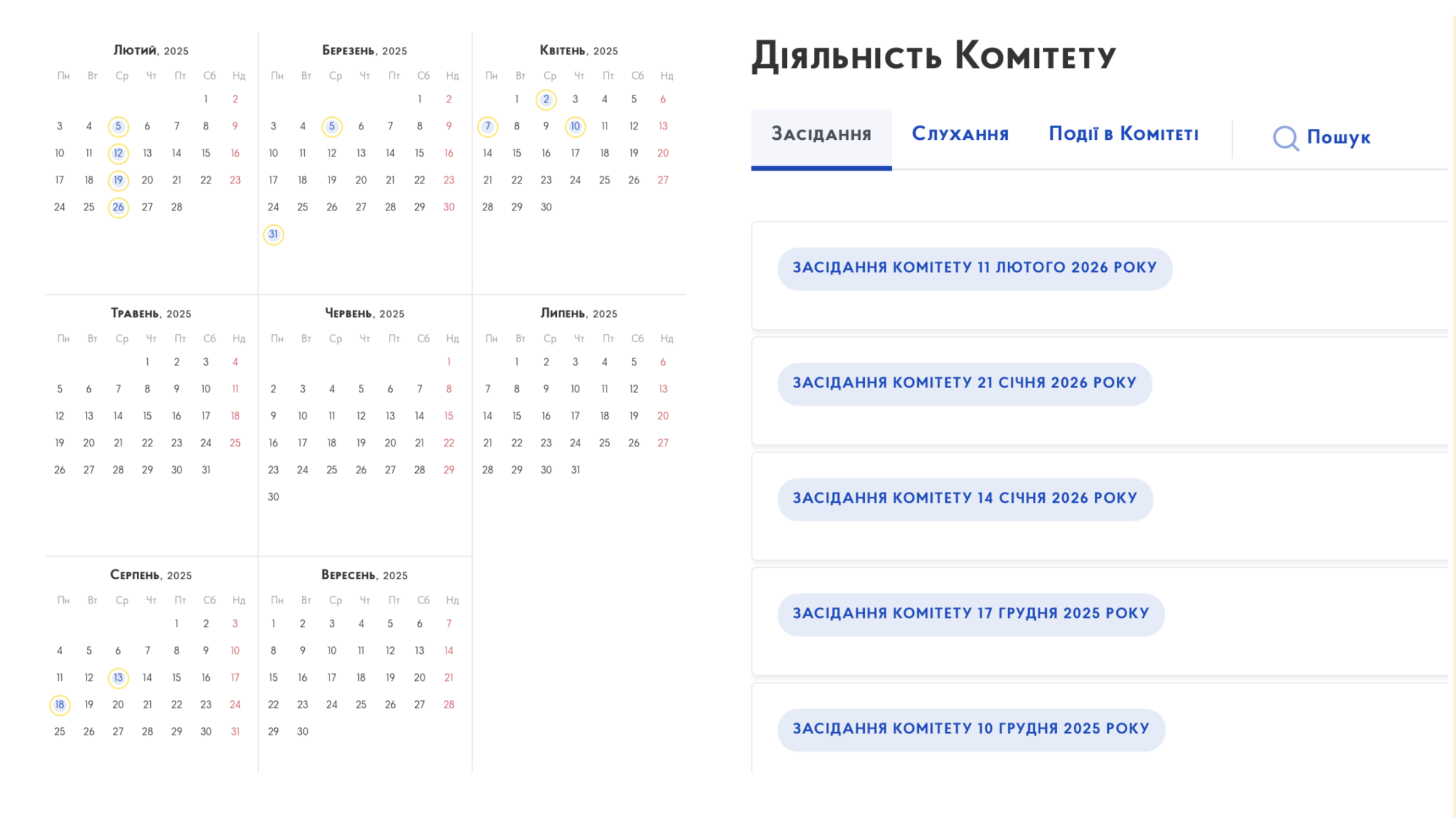А от комітети з питань соцполітики, економічного розвитку та аграрний комітет навпаки дуже активно послуговуються функціоналом календаря і відмічають там не лише засідання, а ще й круглі столи та комітетські слухання.