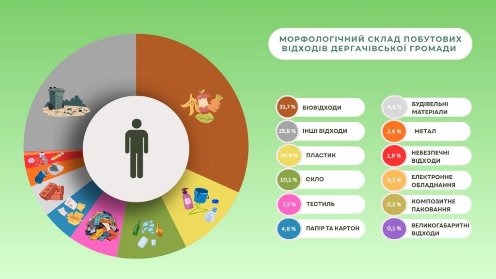 На цьому фоні особливо показовими є дані Дергачівської громади. За результатами морфологічного аналізу, 31,7% побутових відходів — це органіка. Тобто з кожних 100 кг відходів майже 32 кг можна не відвозити на полігон, а компостувати. Якщо громада утворює близько 5 000 тонн відходів на рік, то приблизно 1 600 тонн — це потенційний компост, а не навантаження на полігон.